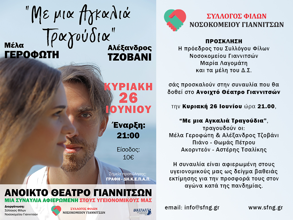 Την Κυριακή 26 Ιουνίου ώρα 21:00 θα πραγματοποιηθεί συναυλία αφιερωμένη στους υγειονομικούς μας ως δείγμα βαθείας εκτίμησης για την προσφορά τους στον αγώνα κατά της πανδημίας.